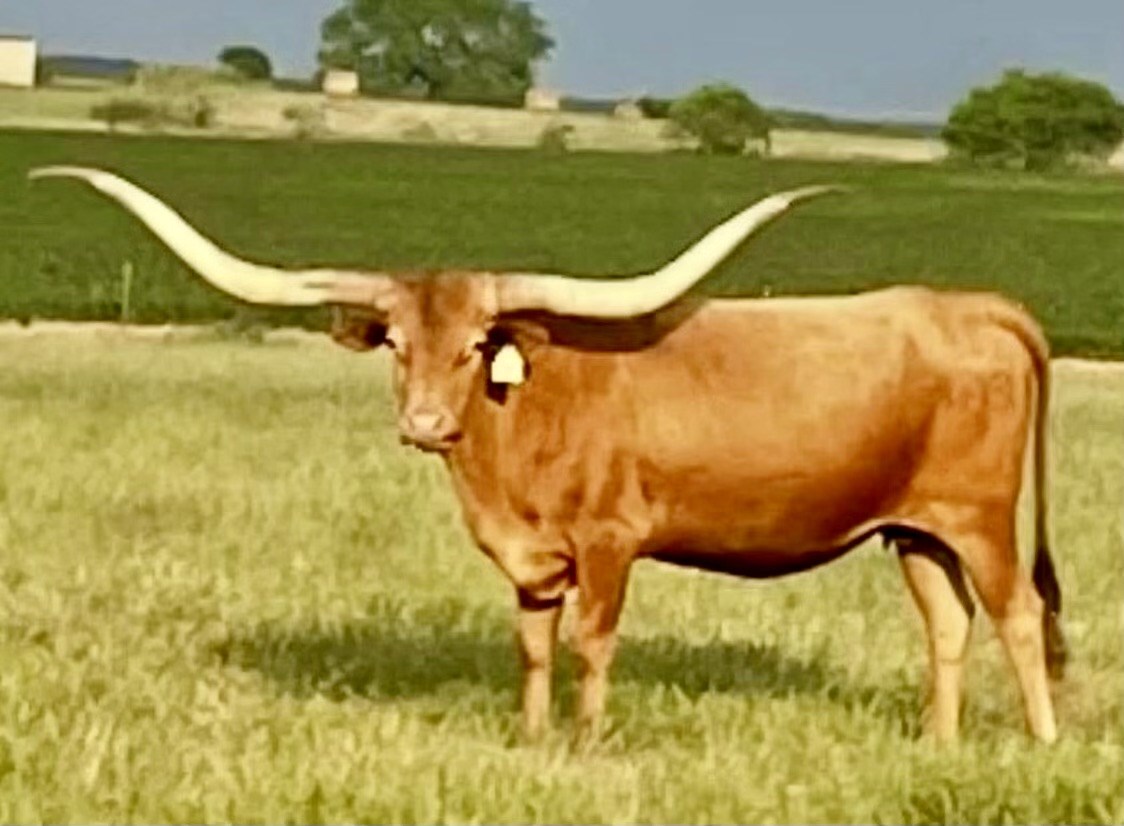 A big Framed correctly built cow. She threw a bull calf for us in 2024 out of Hubbells Butch Cassidy that we loaned out to some nice people. Right now she has her 2025 heifer by her side out of Batman that were about to wean off. This heifer is already showing signs of a lot of horn and very nice built....long and powerful. This is a nervous acting cow and she holds her head high but she is not mean. for some reason we have noticed she doesn't like going through gates. Very good cow but seems to be just a little bit of a hard keeper depending on the grass situation.